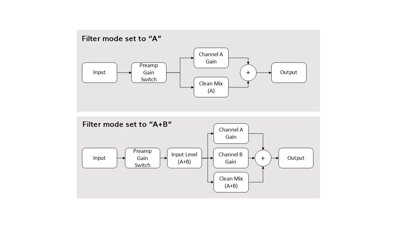 Clean Mix (A+B): In A+B mode, adjusts the level of clean signal blended with filter outputs from Channels A and B.
